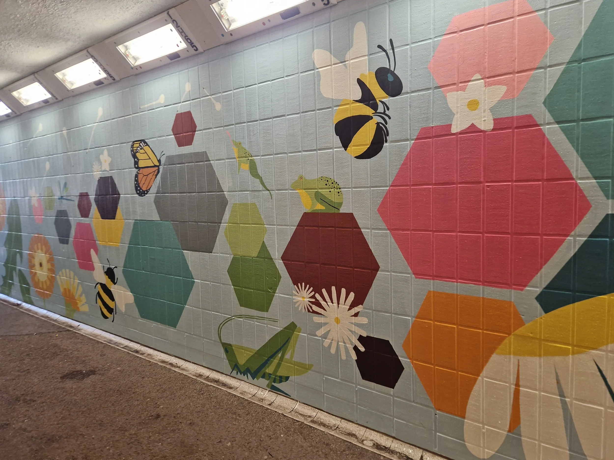 Over two months, I had the pleasure of working with 12 talented post-16 students with special educational needs from Beaucroft College, guiding them through the creative process as they worked toward their Arts Award Accreditation. Each student created their own artwork within a series of colourful hexagons on the wall, while I brought the surrounding mural to life. Together, we transformed Wimborne’s 52-foot Hanham Road underpass into a vibrant celebration of nature—filled with blooming flowers, buzzing bees, bright birds, and curious creatures. Funded by Wimborne BID, the mural now links the Allendale car parks and river path to the town centre with a joyful burst of colour. It’s a space for the whole community to enjoy, and a project I’m incredibly proud to have brought to life with such a brilliant team.